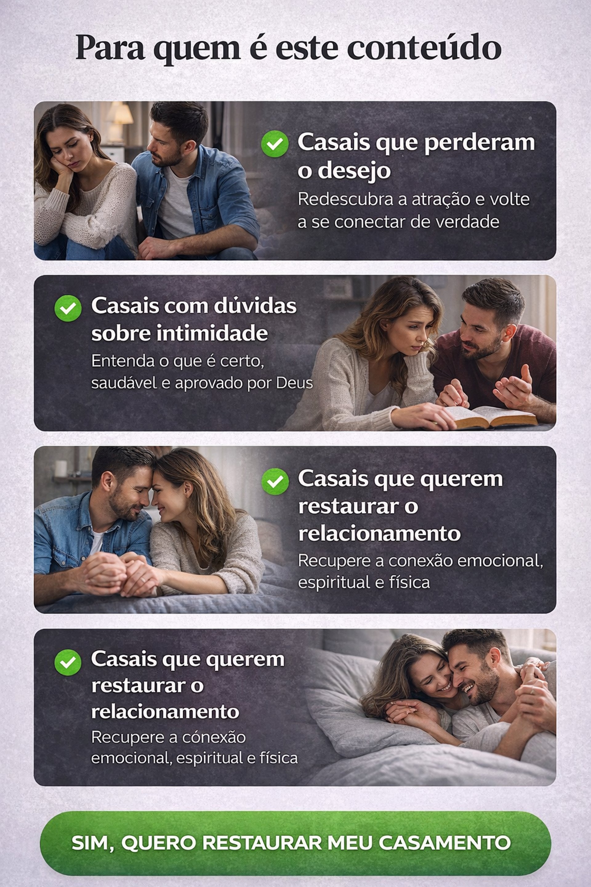 Ao adquirir agora, você terá acesso imediato a um conteúdo bíblico, profundo e transformador, que vai te guiar passo a passo na restauração da intimidade no seu casamento.